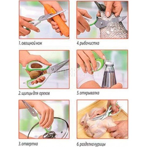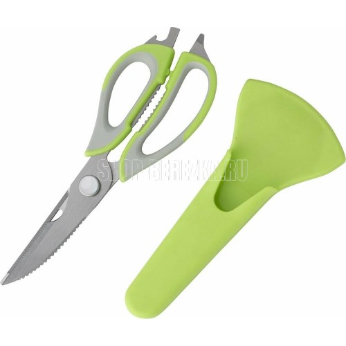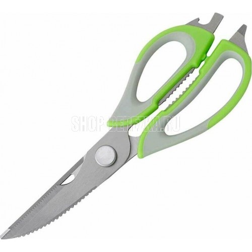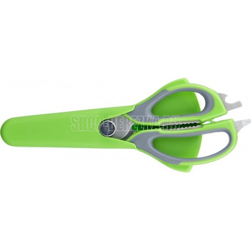 Длина ножниц: 22,8 см Удобный пластиковый чехол в комплекте Толщина стали: 2,8 мм Материалы: лезвие — нержавеющая сталь, ручка и чехол — пластик Ножницы предназначены для: - разделки птицы; - вскрытия картонных и полимерных упаковок; - чистки рыбы, срезания плавников (съемные лезвия); - в качестве ножа для овощей (съемные лезвия); - в качестве щипцов для колки орехов; - как консервный нож; - как открывашку для бутылок; - как овощечистку (съемные лезвия). Упаковка: европодвес