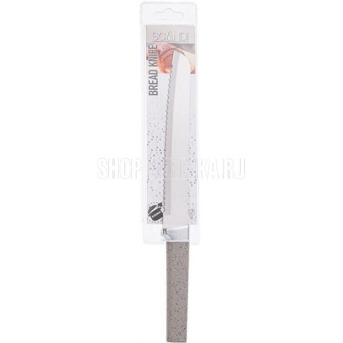 Нож для хлеба Длина лезвия: 20 см Толщина стали: 1,5 мм Пластиковая рукоятка с покрытием soft-touch (ТПР) под мрамор, матовая полировка лезвия. Материал: нержавеющая сталь (2CR14), полипропилен, ТПР.