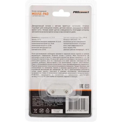 Светодиодный ночник с датчиком «день-ночь» , для освещения бытовых помещений, коридоров, спален и санузлов в темное время суток. Благодаря мягкому белому свечению создает уют и комфорт в помещении. Выполнен из качественного белого пластика. Светодиодное освещение служит гораздо дольше обычных ламп и значительно сокращает энергопотребление. Датчик освещённости автоматически отключает светильник в светлое время суток и включает при недостаточной освещенности, что позволяет экономить электричество. Питание от сети AC 230 В/50 Гц. Размер изделия: 11,8х5,8х5,5 см.