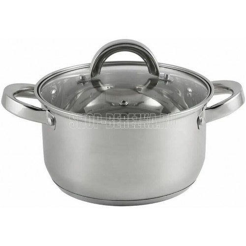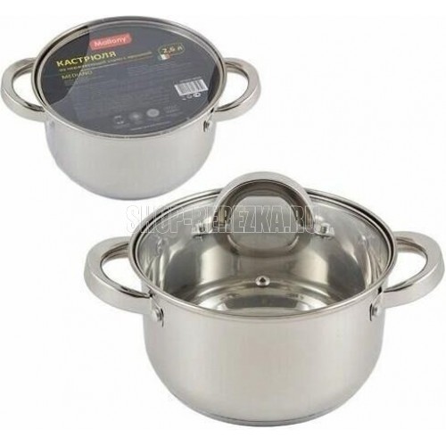 Кастрюля из нерж стали с крышкой, объем 2,6 л, размер: 18*10,5 см, серия "Mediano", тм MALLONY Кастрюля из нерж стали с крышкой, 2,6 л 18*10,5 см размер, литраж 2,6 л, 201 нержавеющая сталь, толщина - 0,35 мм, дно 3-слойное капсулированное - нерж сталь 201 +1 мм алюминия + 430 сталь (толщина дна - 1,7 мм), подходит для индукции, снаружи и внутри - зеркальная полировка, полые ручки из нерж стали, С-тип крышка из жаропрочного стекла с отверстием для выпуска пара.Отметки литража. Упаковка - цветной картонный вкладыш, термоусадка (крышка в перевернутом виде внурь кастрюли). Не рекомендуется мыть в посудомоечной машине. Метод производства - штампованная. Тип крепления ручек - заклепочное. Подходит для всех типов плит.