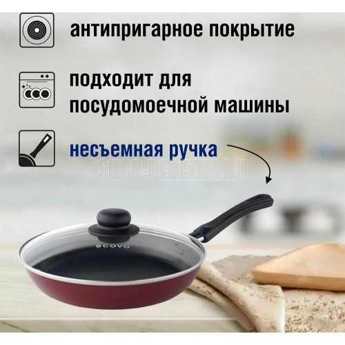 Диаметр 24см. Крышка стекл. Основание алюминий 1,8 мм. Внешнее покрытие декоративное, цвет- Бордовый. Европейская фурнитура. Быстрый и равномерный нагрев. Высокие антипригарные свойства. Подходит для газовых плит, стеклокерамических плит и электроплит. Можно мыть в посудомоечной машине.