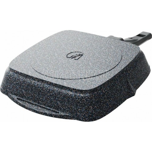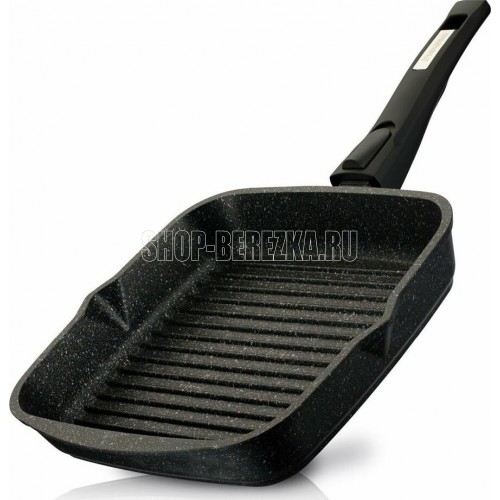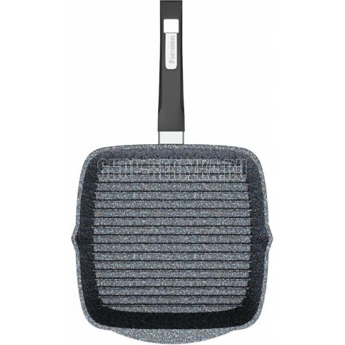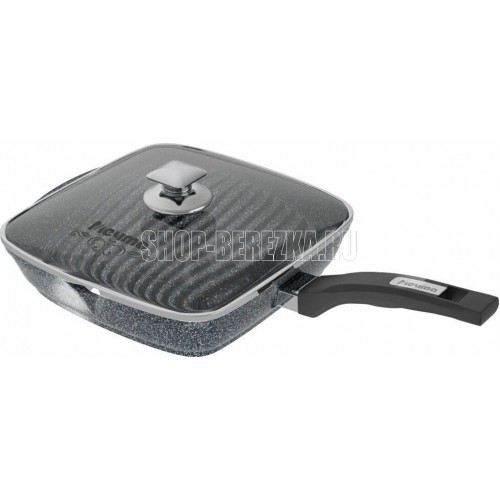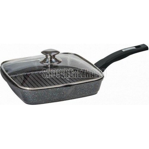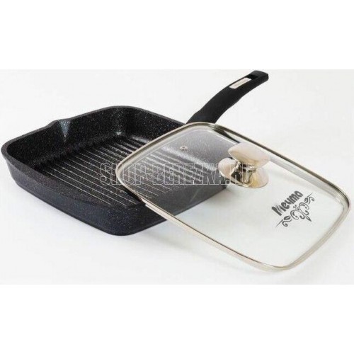 Сковорода-гриль квадр. 24*24 см с антипригарным покрытием, несъемной ручкой и стеклянной крышкой серии "Гранит star". Подходит для всех типов плит, кроме индукционных. Можно использовать в посудомоечной машине.