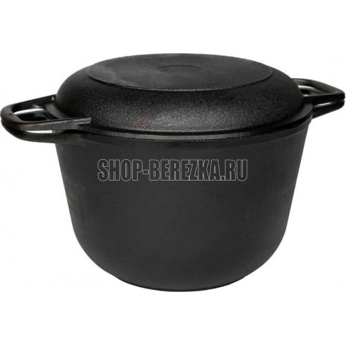 Чугунная кастрюля с чугунной крышкой-сковородой объёмом 6 литров – дополнение к современной кухне. Для любителей тушеных, жареных и запеченых блюд идеальный вариант — чугунная кастрюля, поскольку именно благодаря толстым стенкам при тушении сохраняется всё вкусовое богатство и пикантный аромат блюда. За счет того, что чугун имеет повышенную теплоемкость, он долго сохраняет жар после приготовления, что дает возможность блюдам раскрыться и дойти в режиме томления. В кастрюле также отлично получатся такие блюда как: шурпа, харчо, жаркое, плов и лагман. Чугунная кастрюля в комплекте с чугунной крышкой-сковородой 2 в 1. Подходит для всех типов плит.
