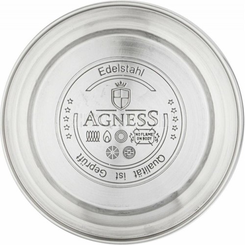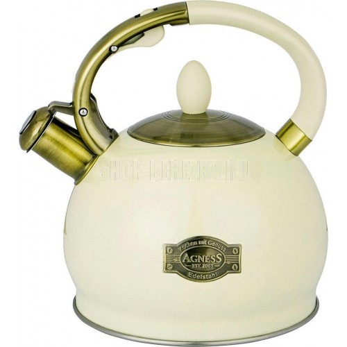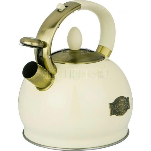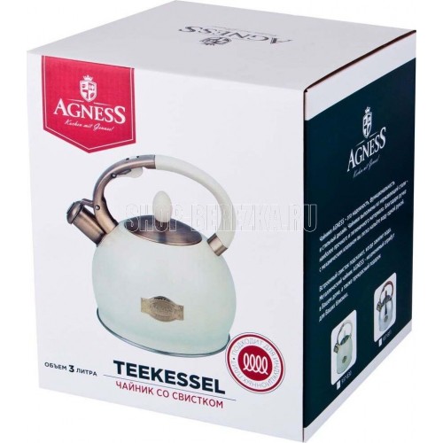 Чайник AGNESS - это надежность, функциональность и стильный дизайн. Чайник выполнен из нержавеющей стали - наиболее прочного и гигиеничного материала. Преимущества: • Капсульное термоаккумулирующее дно с прослойкой из алюминия позволяет воде в чайнике дольше оставаться горячей. В чайниках с термоаккумулирующим дном вода закипает быстрее, и дольше остается горячей. • Удобная не нагревающаяся ручка • Легко наливать воду. Используя клапан на ручке чайника, вы легко сможете налить воду. Просто нажмите на клапан, чтобы открыть носик чайника. • Встроенный свисток подскажет, что вода в чайнике закипела и его пора снимать с плиты. • Благодаря внешнее жаропрочному покрытию и стильному дизайну чайник AGNESS украсит любую кухню • Подходит для всех типов плит, включая Индукционные
