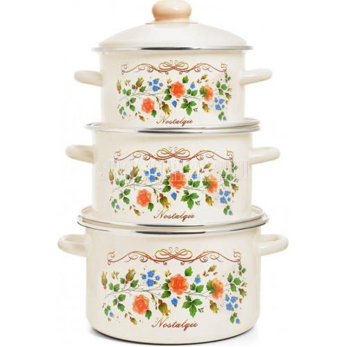 Диаметр (см): 230мм Высота (см): 255мм Длинна (см): 270мм Ширина (см): 230мм Количество предметов: 1 Состав комплекта: кастрюля-3шт; крышка-3 шт Совместимость: Универсальная Материал дна: Эмалированная сталь Крышка: Да Литраж: 2.0 л 3.0 л 4.0 л Толщина стенок: 1.7 мм Толщина дна: 1.7 мм Рисунок: ностальгия Вид упаковки: без термоусадочная пленка Материал: Эмалированная сталь