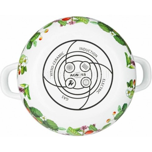 Эмалированная посуда AGNESS - отличный выбор для Вашей кухни Многие профессиональные повара и домохозяйки выбирают эмалированную посуду. И это не удивительно. Эмалированная посуда обладает целым рядом преимуществ: * Эмалированная посуда не требует особого ухода и легко моется * Эмалированная посуда гигиенична - не удерживает болезнетворных микробов и бактерий * На поверхности эмалированной посуды не остается запаха пищи * В эмалированной посуде можно не только готовить, но и хранить приготовленные блюда, причем довольно долгое время * Подходит для всех типов плит, включая индукционные * Можно мыть в посудомоечной машине * Толщина стенок 0,5мм Посуда проходит 3 этапа обжига, эта технология позволяет сохранить яркость расцветок деколи, а также придает прочность эмалированной посуде Все деколи наносятся в ручную, а затем обжигаются при температуре около 800 С Стильный и нежный декор эмалированной посуды украсит любую кухню. Высота кастр