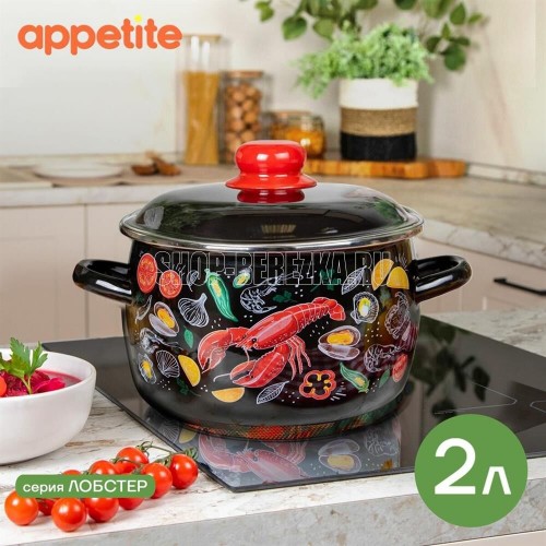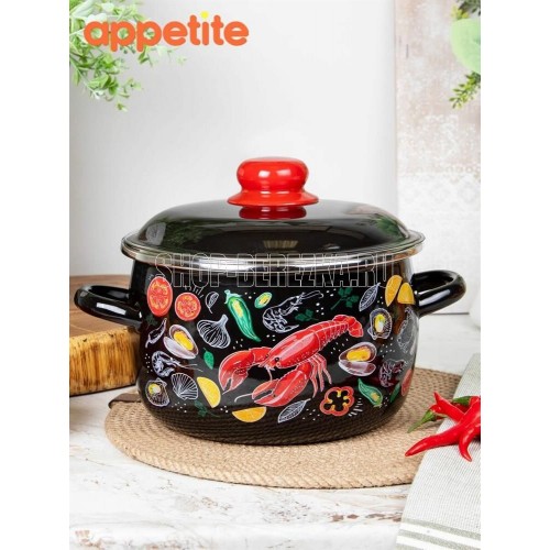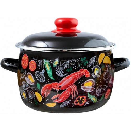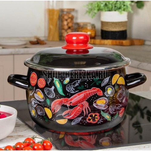 Необычная, яркая контрастная деколь с изображением морепродуктов на черной эмалированной посуде станет заметным акцентом на современной кухне. Наблюдение за изображениями лобстеров и морепродуктов может стать источником вдохновения для кулинарных экспериментов, создания новых рецептов и приготовления блюд, которые доставят удовольствие и радость. Посуда создана из экологичного природного сырья и соответствует стандартам ГОСТ, что гарантирует отсутствие химических реакций и сохраняет вкус пищи при приготовлении. Стекловидное эмалированное покрытие надежно предохраняет металл основания от контакта с продуктами. Изделия подходят для всех видов плит: газовых, электрических и индукционных.