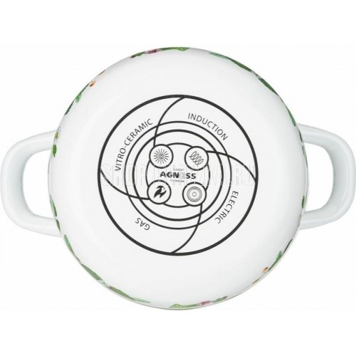 Эмалированная посуда AGNESS - отличный выбор для Вашей кухни! Многие профессиональные повара и домохозяйки выбирают эмалированную посуду. И это не удивительно. Эмалированная посуда обладает целым рядом преимуществ: * Эмалированная посуда не требует особого ухода и легко моется * Эмалированная посуда гигиенична - не удерживает болезнетворных микробов и бактерий * На поверхности эмалированной посуды не остается запаха пищи * В эмалированной посуде можно не только готовить, но и хранить приготовленные блюда, причем довольно долгое время * Подходит для всех типов плит, включая индукционные * Можно мыть в посудомоечной машине * Толщина стенок 0,5мм • Посуда проходит 3 этапа обжига, эта технология позволяет сохранить яркость расцветок деколи, а также придает прочность эмалированной посуде • Все деколи наносятся в ручную, а затем обжигаются при температуре около 800 С