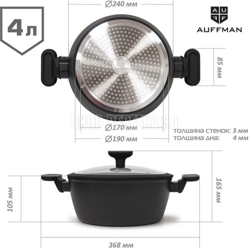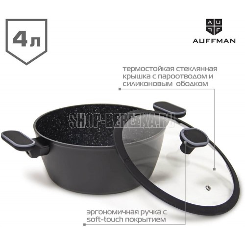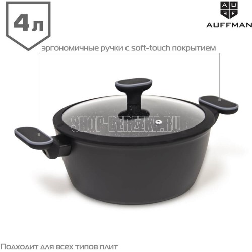 Кастрюля. Кованый алюминий Толщина края 4мм, толщина изделия 3мм Индукционное дно Ручка с софт-тач покрытием Внутри антипригарное мраморное покрытие с белыми точками, 2 слоя Снаружи высокотемпературное покрытие Подходит для всех видов плит, включая индукц