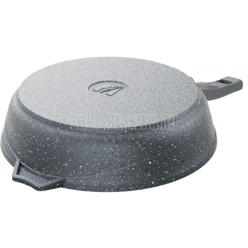 Сковорода 24 см. с несъемной ручкой из бакелита и стеклянной крышкой. Антипригарное покрытие Greblon Rough на водной основе без PFOA. Серия "Гранит". Подходит для всех типов плит, кроме индукционных. Можно использовать в посудомоечной машине. Ресурс более 15 000 циклов, толщина покрытия до 55 мкр. Толщина дна 5,5-6мм., толщина стенок 3,6-4мм. Покрытие Greblon позволяет готовить с минимальным количеством масла, сохраняя вкусовые и полезные свойства продуктов. Литой толстостенный корпус не подвержен деформации, а утолщенное дно равномерно распределяет тепло по всей поверхности.