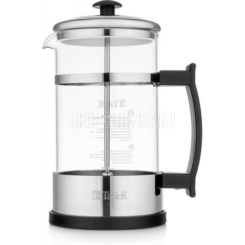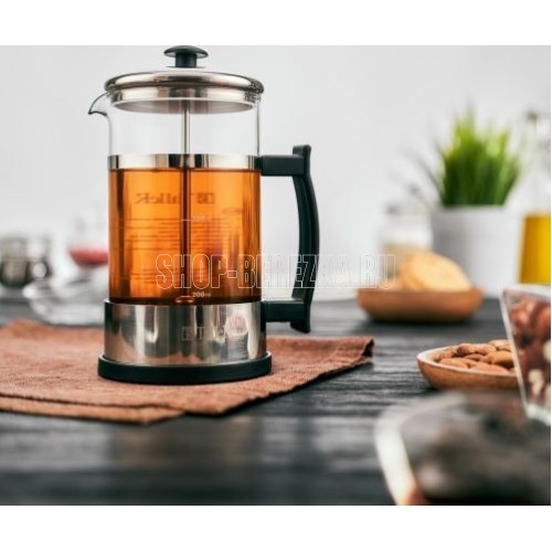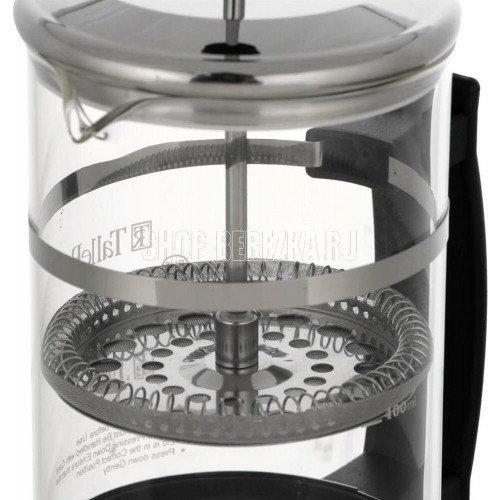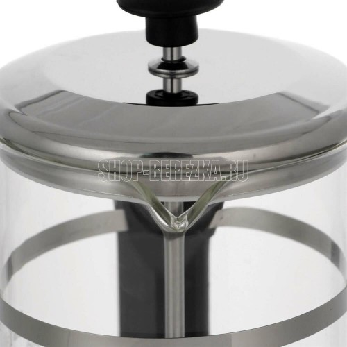 френч-пресс 600 мл, мерная ложка, буклет с рецептами Материалы: боросиликатное стекло, высококачественная нержавеющая сталь Толщины: стекло — 2,0 мм, подстаканник — 0,8 мм, детали пресс-фильтра — 0,3 мм Пригоден для мытья в посудомоечной машине