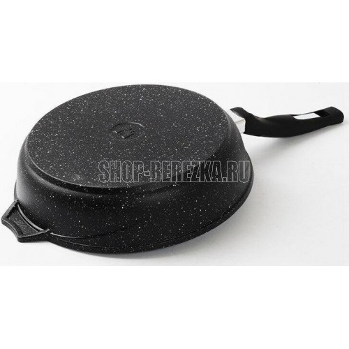 Сковорода 18 см с антипригарным покрынием и несъемной ручкой серии "Гранит black". Подходит для всех типов плит, кроме индукционных. Можно использовать в посудомоечной машине.