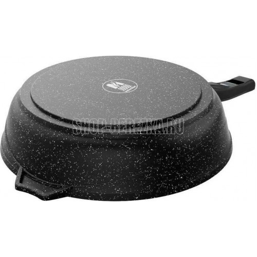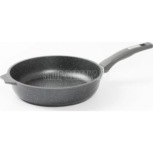 Сковорода 24см с антипригарным покрынием и несъемной ручкой серии "Гранит black". Подходит для всех типов плит, кроме индукционных. Можно использовать в посудомоечной машине.