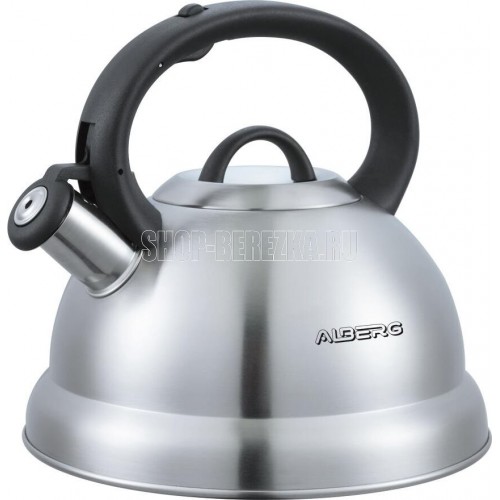 Объем: 3 л Свисток с курковым механизмом открывания Нержавеющая сталь 0.5 мм Матовая полировка Фиксированная ручка 3-х слойное термоаккумулирующее капсулированное индукционное дно Подходит для всех видов плит, включая индукционные Вес чайника: 800 г