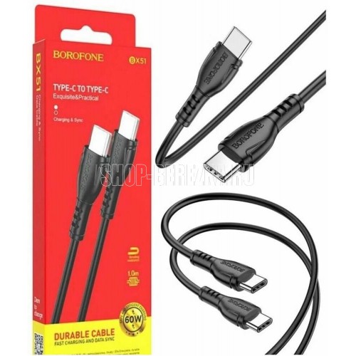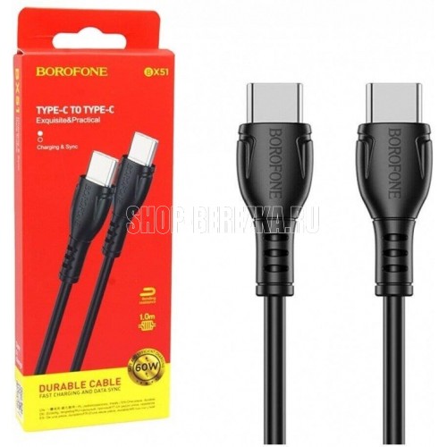 Дата-кабель Borofone BX51 Type-C to Type-C имеет наружный материал- ПВХ. С подходящим зарядным устройством PD он поддерживает зарядную мощность до 60 Вт для ноутбуков, а зарядка мобильного устройства с интерфейсом Type-C поддерживает ток 3А.