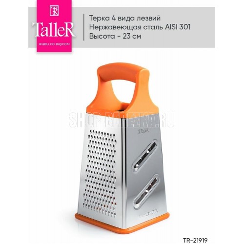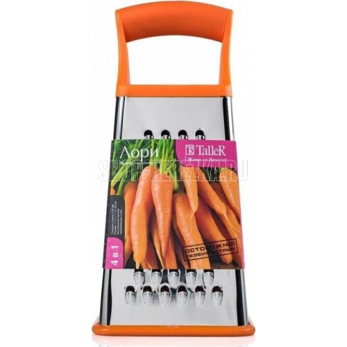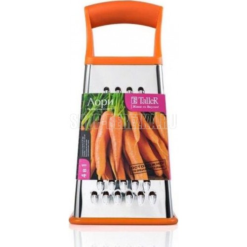 Терка 4 в 1 "Лори", размеры 11,5*11*23 см. Ручка удобной формы не выскальзывает из рук даже при намокании. Нескользящий силиконовый протектор на основании предотвращает скольжение во время использования и защищает поверхность от повреждений. Новая форма л