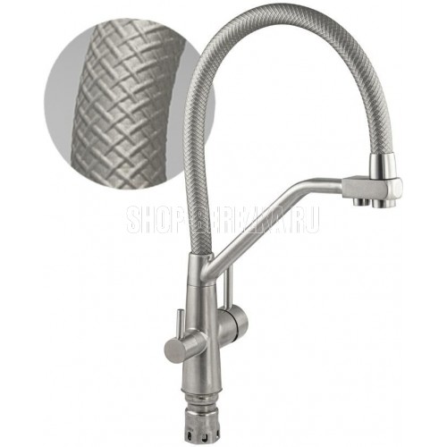 МАГНУС 91131 Смеситель для кухни с гибким серым рельефным изливом, с фиксацией на изливе, для фильтрованной воды, шаровый, из нержавеющей стали марка SUS 304, цвет корпуса САТИН