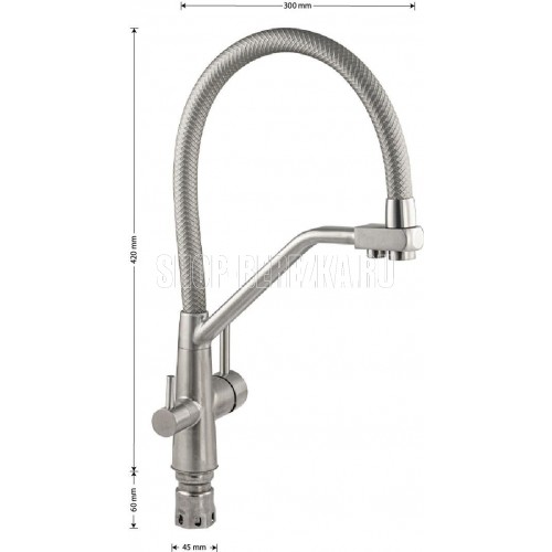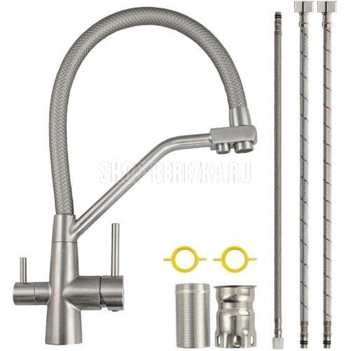 Смеситель для кухонной мойки и раковин с двойным выпуском воды для фильтра, литой матовый корпус, из нержавеющей стали марка SUS 304, с гибким изливом серого цвета с фиксацией на жёстком изливе, шаровый. Крепление резьба - гайка, картридж d = мм, ручка шток. Аэратор для экономии воды. Такая модель может использоваться на домашней кухне, на даче, в медицинских учреждениях и общественных местах. Габаритные размеры: высота 420 мм, длина 300 мм, диаметр посадочного седла 45 мм, длина резьбы 60 мм, длина подводки 500 мм. Вес - 2.3 кг, объём - 0.00746 м3. В комплекте паспорт, корпус с изливом, подводка 1/2, крепеж, набор прокладок.