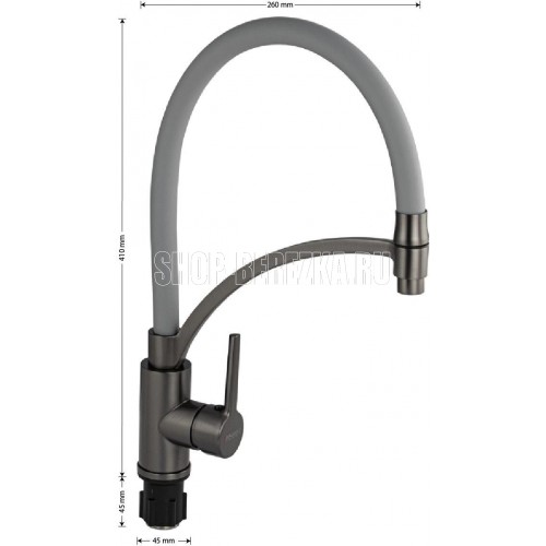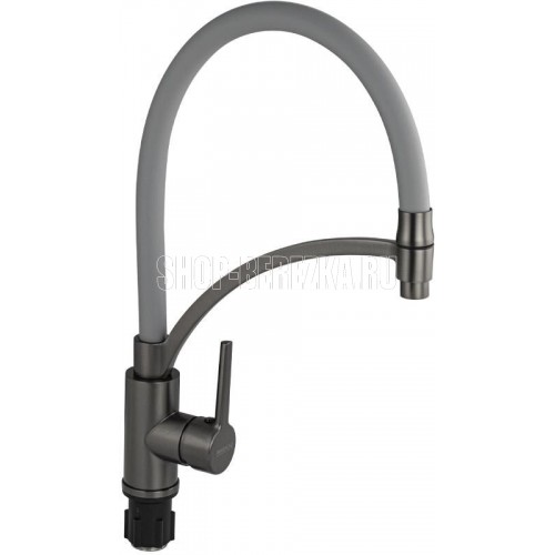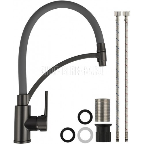 Смеситель для кухонной мойки и раковин, литой матовый корпус цвет графит, из нержавеющей стали марка 304, с высоким гибким изливом тёмно-серого цвета с фиксацией, с аэратором для экономии воды, шаровый, Крепление резьба - гайка, картридж d = 35 мм, ручка литая. Такая модель может использоваться на домашней кухне, на даче, в медицинских учреждениях и общественных местах. Габаритные размеры: высота 410 мм, длина 260 мм, диаметр посадочного седла 45 мм, длина резьбы 45 мм, длина подводки 450 мм. Вес - 1,7 кг, объём - 0,00462 м3. В комплекте паспорт, корпус с изливом, подводка 1/2, крепеж, набор прокладок