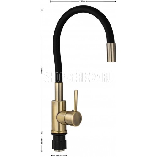 Смеситель для кухонной мойки и раковин, литой корпус, из нержавеющей стали марки 304, с высоким гибким изливом чёрного цвета, с аэратором для экономии воды, шаровый, цвет бронза. Крепление резьба - гайка, картридж d = 35 мм, ручка литая. Такая модель может использоваться на домашней кухне, на даче, в медицинских учреждениях и общественных местах. Габаритные размеры: высота до 350 мм, длина до 250 мм, диаметр посадочного седла 45 мм, длина резьбы 55 мм, длина подводки 450 мм. Вес - 1,8 кг, объём - 0,0042 м3. В комплекте паспорт, корпус с изливом, подводка 1/2, крепеж, набор прокладок.