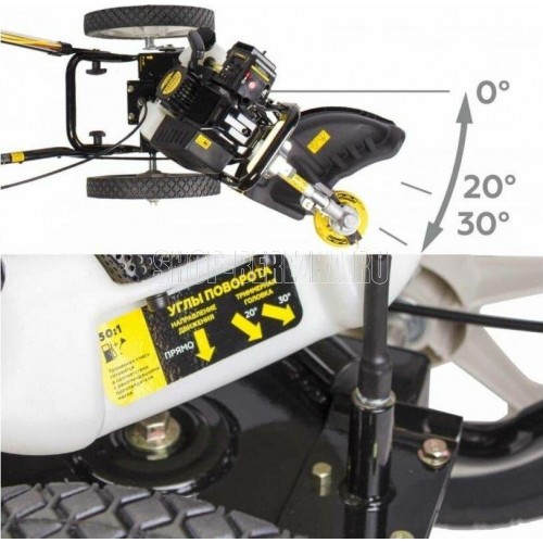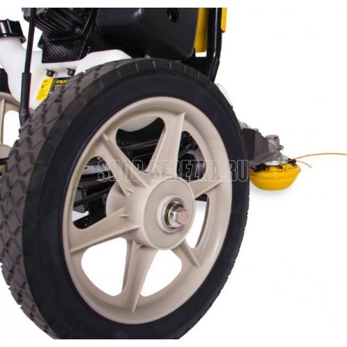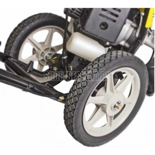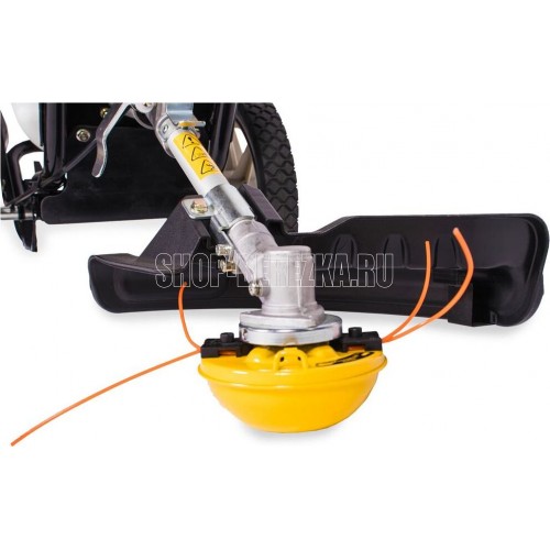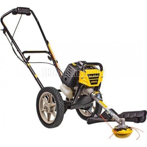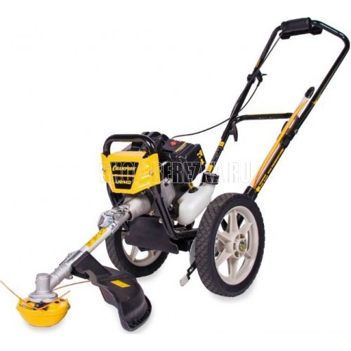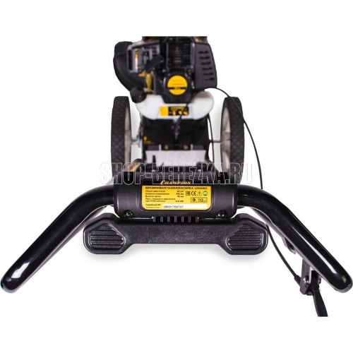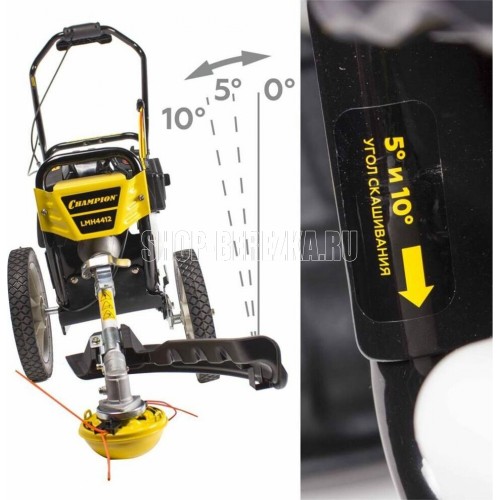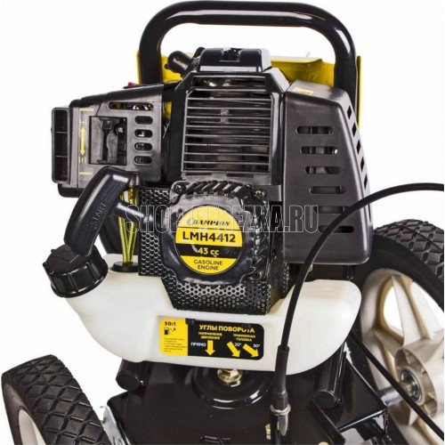 Газонокосилка Champion LMH4412 оснащена двухтактным двигателем. Имеет большие колеса и укороченный вал. Редуктор передает крутящий момент триммерной головке. Для работы в труднодоступных местах предусмотрен поворот штанги триммерной головки вправо (по ходу движения) на два положения - 20° и 30°. Агрегат может выкашивать заросли у кромки забора, в углублениях вокруг деревьев, длинные склоны. Укомплектован контейнером для хранения запасного корда. Возможно использование толстого корда диаметром до 4 мм. Объем двигателя, см3- 43. Емкость бака, л 0,84. Режущий элемент леска. Габариты, мм 360х450х650. Ширина скашивания, см 43.2. Вес, кг 18. Тип ручки d-образная. Тип двигателя бензиновый.Частота вращения шпинделя, об/мин 3000. Приводной вал гибкий. Мощность (кВт) 0,8 .Мощность (л.с.) 1,1. Толщина лески, мм 2.4.