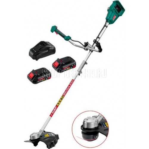 Напряжение изделия, В 36. Частота вращения шпинделя, об/мин 0-7000. Расположение двигателя нижнее. Режущий элемент леска / нож. Ширина скашивания (леска), мм 350. Ширина скашивания (нож), мм 255. Толщина лески, мм 2. Емкость аккумулятора, А·ч 2.0. Количество аккумуляторов 2. Зарядное устройство импульсное. Время заряда батареи, ч 1. Тип катушки полуавтоматическая. Тип рукоятки велосипедная. Тип штанги разъемная. Тип приводного вала - Ремень есть. Габариты, см 95х31.5х17.5.