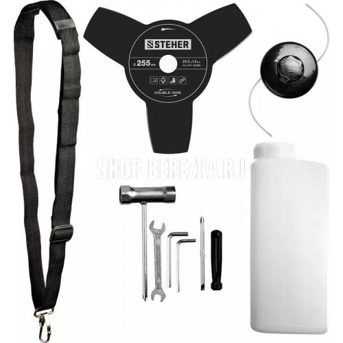 Габариты, см: 103x29x31 Мощность, л.с.: 1.7 Плечевой ремень: есть Приводной вал: жесткий Тип двигателя: бензиновый Тип ручки: u-образная (велосипедная) Частота вращения шпинделя, об/мин: 9000 Ширина скашивания для ножа, мм: 255 Мощность, кВт: 1.3 Режущий элемент: леска/нож Вес, кг: 7 Объем двигателя, см3: 43 Емкость бака, л: 1.2 Толщина лески, мм: 2 Ширина скашивания для лески, мм: 470 КОМПЛЕКТАЦИЯ: Коса бензиновая - 1 шт. Велосипедная рукоятка - 1 шт. Кожух защитный - 1 шт. Нож - 1 шт. Катушка с леской - 1 шт. Ключ (свечной, гаечный, имбусовый) - 3 шт. Фиксатор вала - 1 шт. Плечевой ремень - 1 шт. Емкость для смешивания - 1 шт. Руководство по эксплуатации - 1 экз.