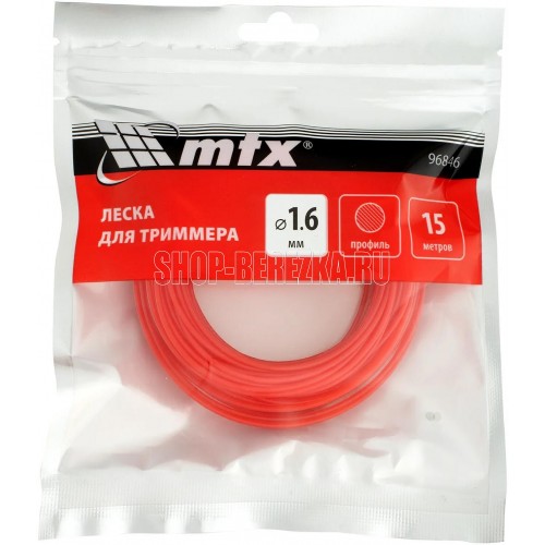 Леска для триммера MTX 96846 круглого сечения, диаметром 1,6 мм и длиной 15 м, предназначена для скашивания мягкой газонной травы.