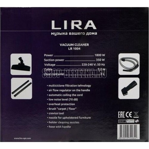 Мощность 2200 Вт, Мощность всасывания 400 Вт, Объём контейнера для сбора пыли 2 л, Уровень шума 70 дБ, Длина шнура питания: 3,5м, Система «Мультициклон», обеспечивающая эффективную уборку без использования мешка для сбора пыли, Многоуровневая система фильтрации, Металлическая телескопическая труба, Регулятор потока воздуха на ручке, Вертикальная парковка трубы всасывания на корпусе, Удобная ручка для переноски, Автоматическое сматывание сетевого шнура, Низкий уровень шума, Защита от перегрева, Аксессуары: Насадка для ковра, Щелевая насадка, Шланг с ручкой.