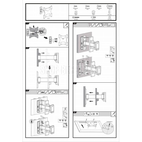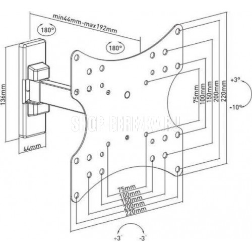 Диагональ экрана: 17"-43". VESA: 75x75, 100x100, 100x150, 150x100, 150x150, 200x100, 200x200. Максимальная нагрузка: 20 кг. Расстояние от стены: 44-192 мм. Угол поворота: +90°~-90°. Угол наклона: +3°~-10°. Горизонт экрана: +3°~-3°. Материал: холоднокатаная сталь, пластик. Протестировано весом в 2 раза больше максимально допустимого. Угол обзора легко регулируется без дополнительных инструментов. Конструкция свободного наклона. Встроенная регулировка уровня и индикатор поворота. Простая конструкция легко устанавливается.
