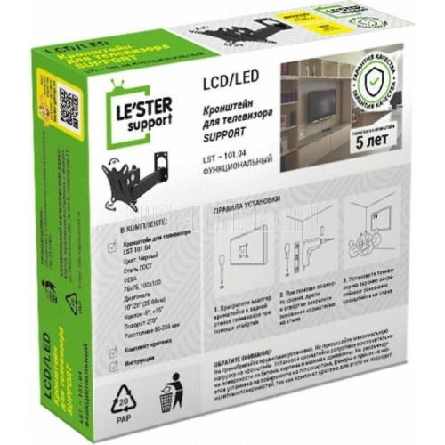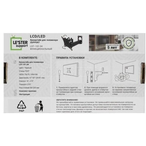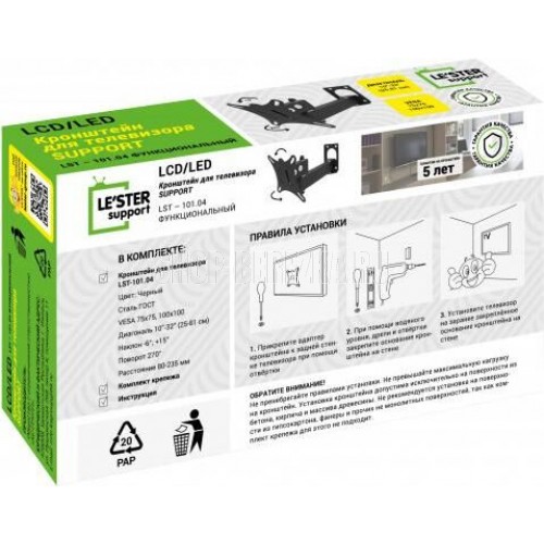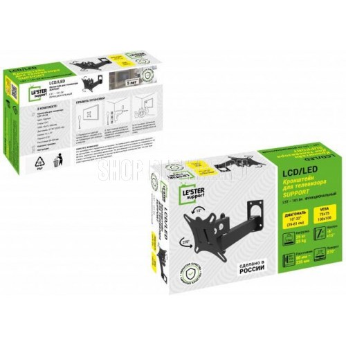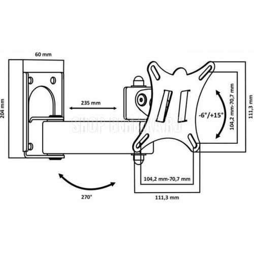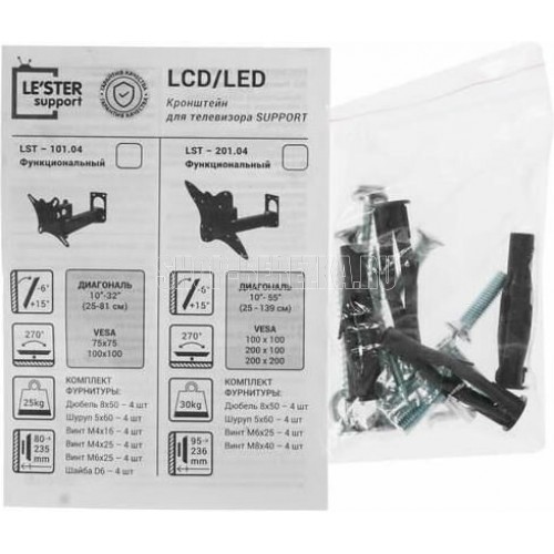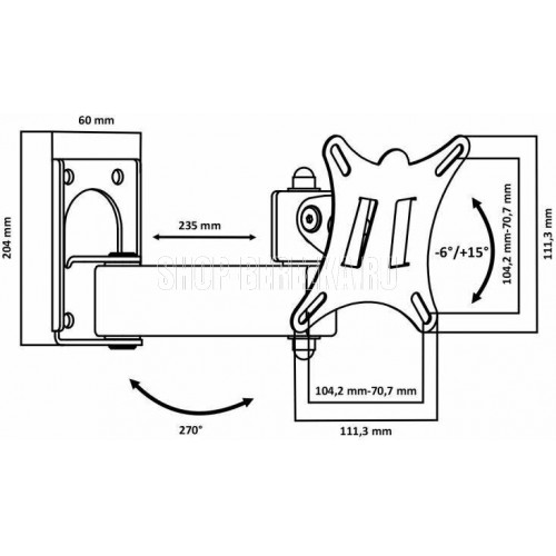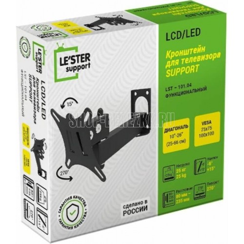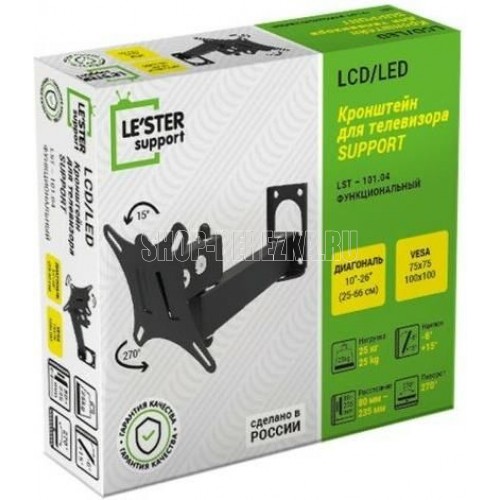 Наклонный-поворотный (Функц) Диагональ: 10"-32" (25-81см) Расстояние от стены: 80-235 мм Угол наклона: -6°/+15° Угол поворота: 270° Нагрузка: 25 кг Толщина металла адаптера 1,5 мм, основания 3 мм. Регулировка угла наклона и поворота без использования инструмента. Vesa 100*100.