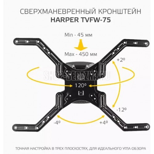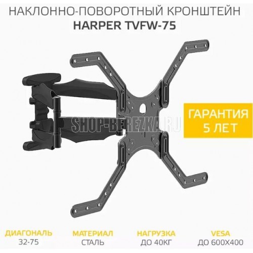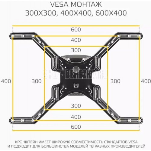Назначение: для LCD- и LED-телевизоров. Совместимость с диагональю ТВ: 32, 40, 42, 43, 50, 55, 60, 65, 70, 75. Тип кронштейна: наклонно-поворотный. Совместимость: поддерживает ТВ с диагональю 32-75. Максимальный вес ТВ: 40 кг. Крепление стандарта Vesa: до 600х400. Типы VESA: 100x100, 200x100, 200x200, 300x300, 400x400, 600x400. Угол наклона: -12°+2°. Масштабирование по горизонтали: да. Масштабирование по вертикали: да. Материал корпуса: сталь, пластик. Минимальное расстояние от стены: 45 мм. Максимальное расстояние от стены: 450 мм. Комплектация: Кронштейн, крепежные детали, инструкция, гарантийный талон. Цвет: черный. Размеры (ШхВхГ): 635x345x450 мм. Вес: 3.4 кг.
