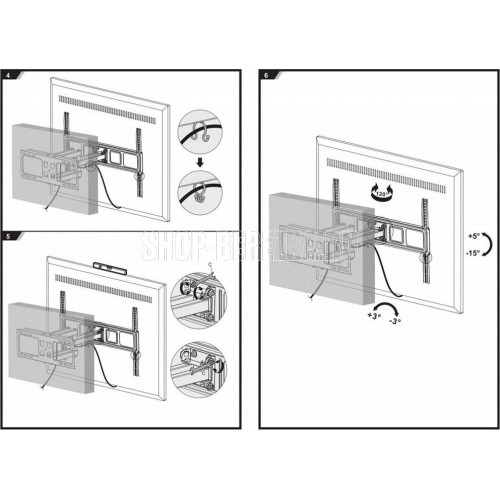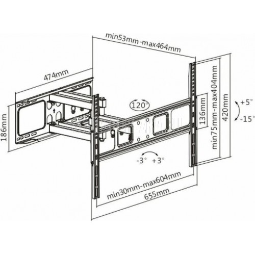 Диагональ экрана: 37"-75". * Подходит для изогнутых телевизоров. VESA: 200x200, 300x300, 400x200, 400x400, 600х400. Максимальная нагрузка: 40 кг. Расстояние от стены: 53-464 мм. Угол поворота: +60°~-60°. Угол наклона: +5°~-15°. Горизонт экрана: +3°~-3°. Материал: холоднокатаная сталь. Протестировано весом в 2 раза больше максимально допустимого. Плавно и легко наклоняется и поворачивается на шарнирах. Встроенная регулировка уровня и индикатор поворота. Направляющие кабеля.