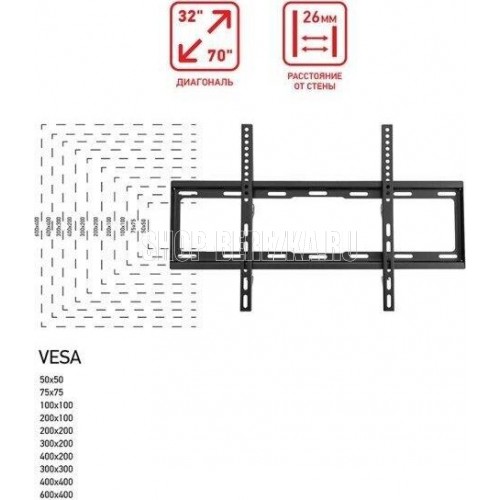 Кронштейн для телевизора. Тип: фиксированный Назначение: телевизионный Цвет: черный глянец Мин. диагональ: ТВ 30 Макс. диагональ: ТВ 70 Максимальный вес оборудования: 40 кг Установка: настенный Расстояние от стены до кронштейна: 23 мм. VESA: 50x50/75x75/100x100/200x200/300x300/400?400/600x400 мм.