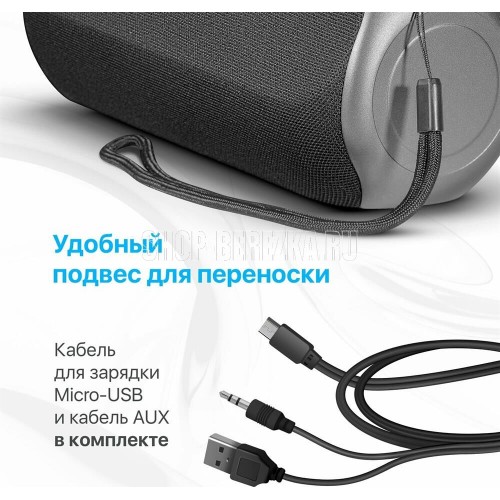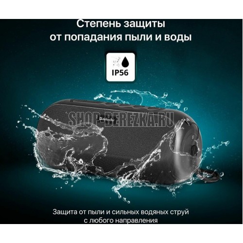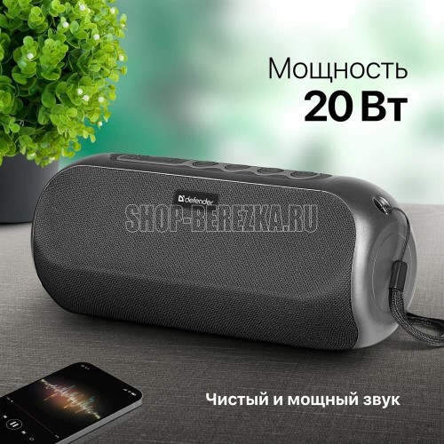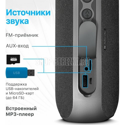 Портативная колонка, Bluetooth 5.0, мощность (RMS) - 20 Вт, диапазон частот 85–20000 Гц, соотношение сигнал/шум - 80 дБ, время работы от аккумулятора 8 час, дополнительный AUX-аудиовход, Питание USB, 5 В , Li-Ion аккумулятор, емкость аккумулятора - 1800 мА·ч, встроенный FM-приемник, радиочастотный диапазон 87.5–108.0 МГц, поддержка USB-накопителей и MicroSD-карт, встроенный MP3-плеер,True Wireless Stereo (TWS) — возможность сопряжения двух отдельных колонок по Bluetooth в акустическую 2.0 систему