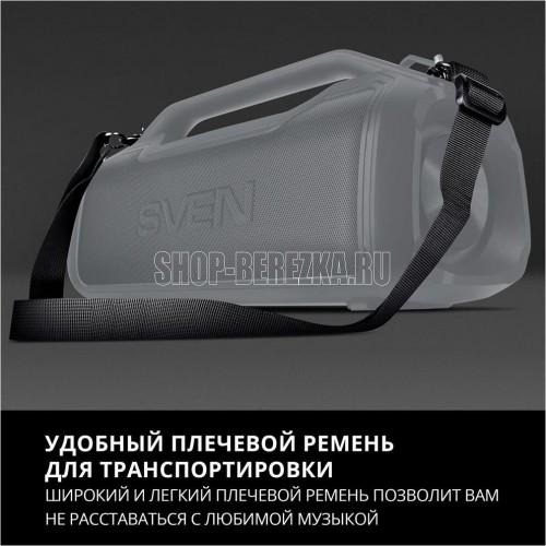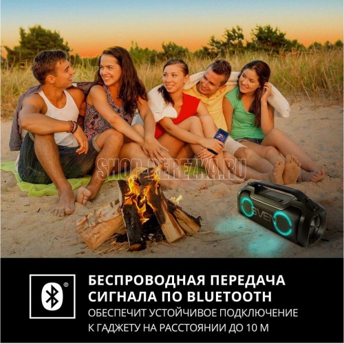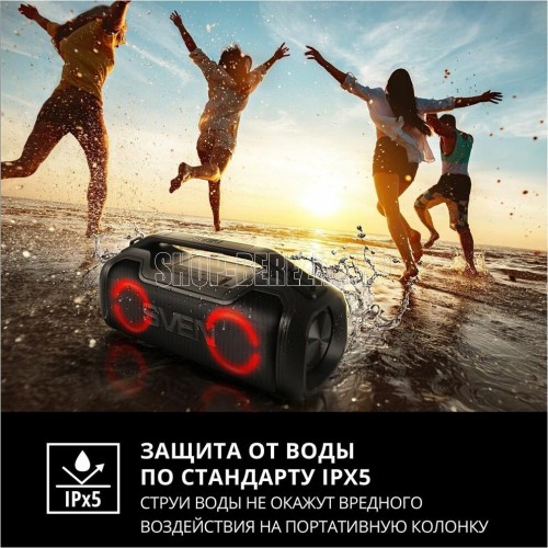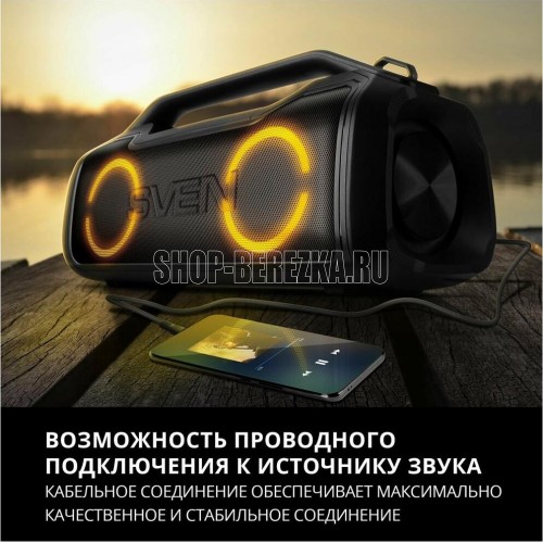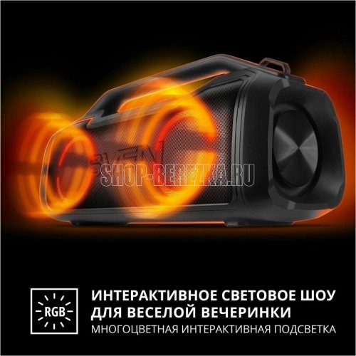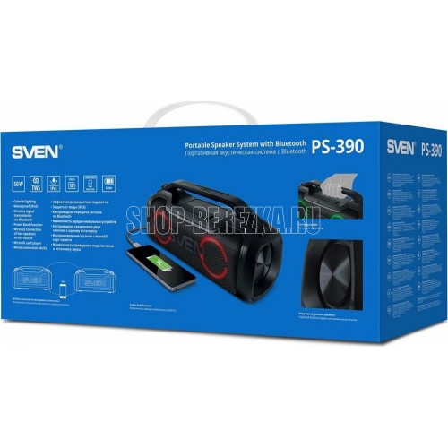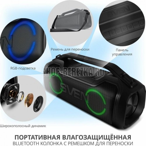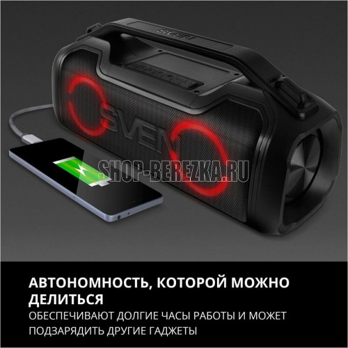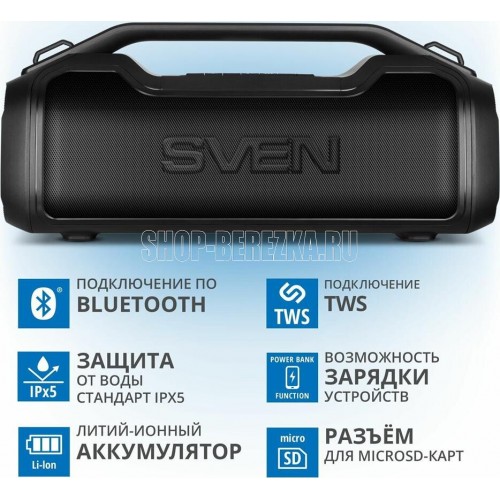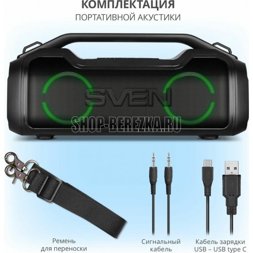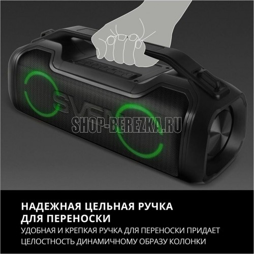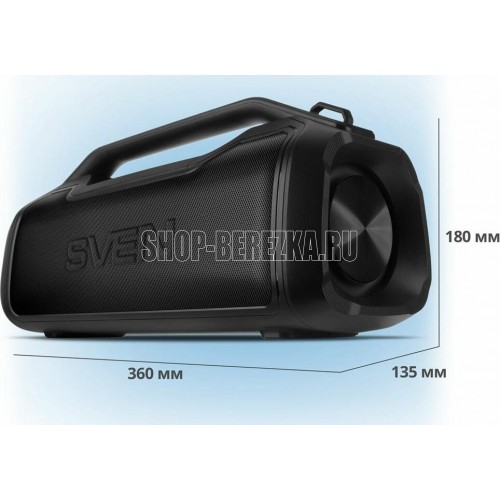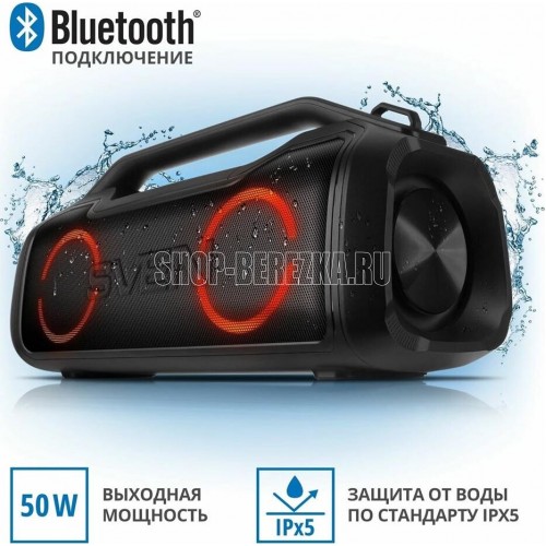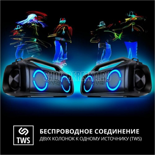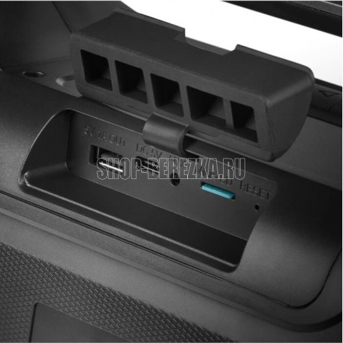Выходная мощность (RMS), Вт 50 (2x25) Частотный диапазон, Гц 50 – 20 000 Размеры динамиков, мм 85, Беспроводная передача сигнала по Bluetooth, Воспроизведение музыки с носителей памяти microSD, Источник питания литий-ионный aккумулятор: 3600 мA · час (2 шт.) USB: DC 5 V Номинальный ток потребления, А 0,76 Тип соединения Bluetooth, проводной Радиус действия, м до 10 Размеры изделия (ШхВхГ), мм 390х137х175 Вес, г 2700 Цвет черный