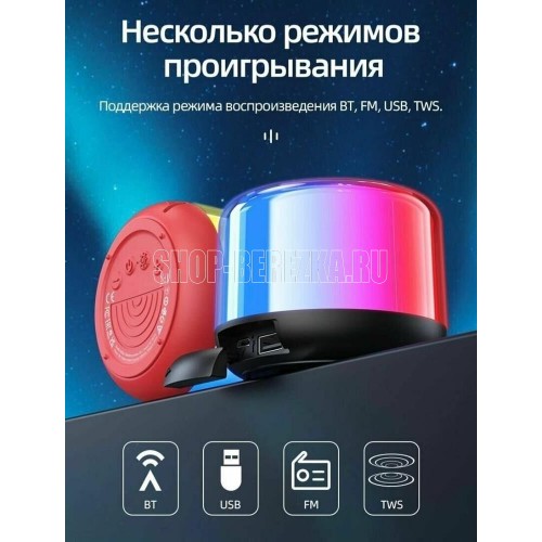 Беспроводная колонка, Bluetooth версии 5.1, даёт возможность прослушивания музыки с флеш карт USB, и имеет режим FM-радиоприемника. Емкость аккумулятора 600мАч - заряда хватит на 2 часа активного использования колонки.