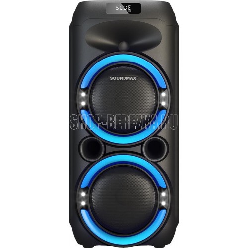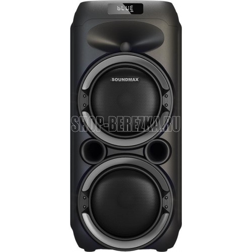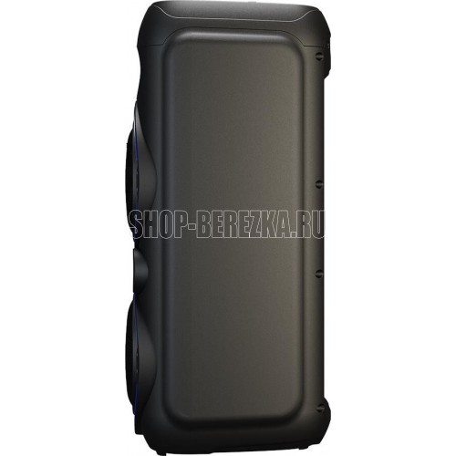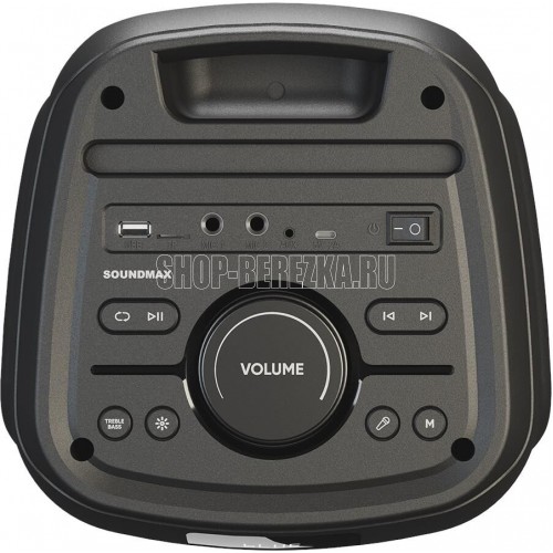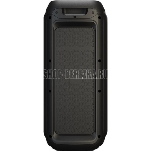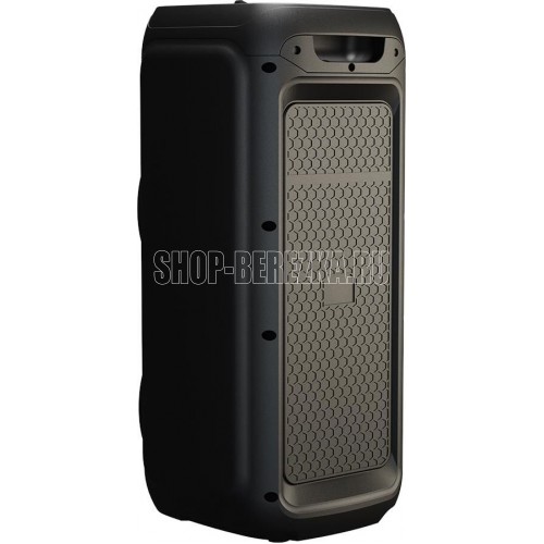 Номинальная выходная мощность (RMS): 80 Вт Пиковая выходная мощность (PMPO): 800 Вт Динамики: 2 x 6.5 + 1 x 1.5 Bluetooth 5.0 Поддерживаемые аудиоформаты: MP3, WAV, WMA, FLAC, SBC Функция True Wireless Stereo (TWS) Цифровой FM-тюнер (87.5-108 МГц) Воспроизведение с USB 2.0 и microSD карты Аудиовход 3.5 мм jack Вход для микрофона 6.35 мм jack Функция караоке Встроенная аккумуляторная батарея: 3000 мАч Время работы от аккумулятора до 8 часов* LED дисплей Многоцветная LED подсветка Размеры устройства: 562 х 266 х 256 мм Цвет: черный
