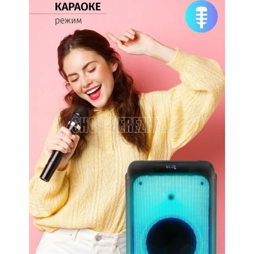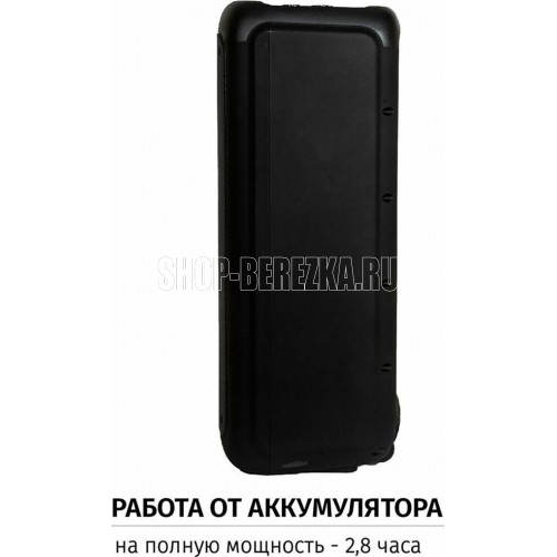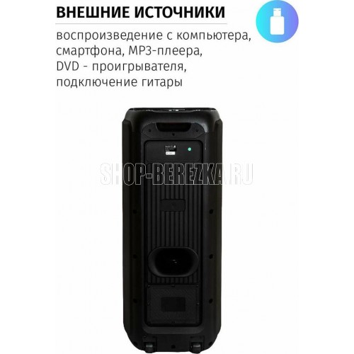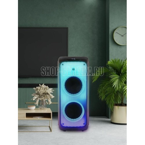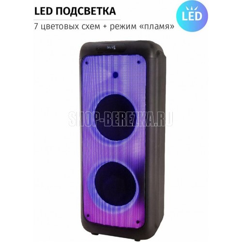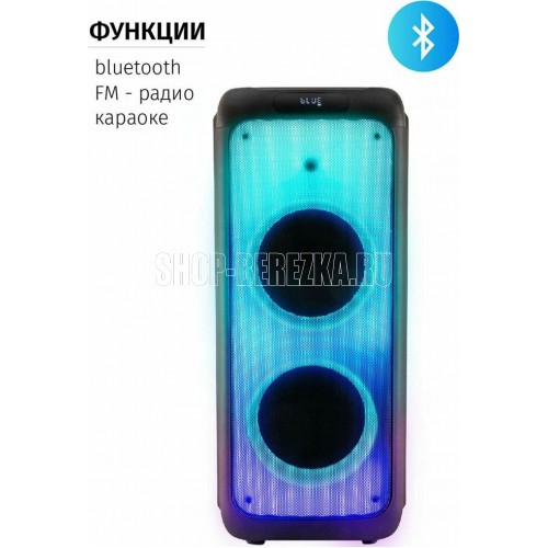 Акустическая система с Bluetooth, FM радио, и TWS. Выходная мощность (RMS), 100Вт, Частотный диапазон: 50Гц - 20кГц, Диапазон частот FM тюнера: 87.5 - 108 МГц, 7 цветовых схем подсветки, режим пламя, Размеры динамиков, низкочастотный динамик - 254мм x2, твитер -25мм, Беспроводная передача сигнала по Bluetooth, Воспроизведение музыки с носителей памяти - USB, TF card, Вход: для микрофона, USB, AUX, TF card, Функция Караоке, Функция регулировки эквалайзера, Функция TWS Встроенная аккумуляторная батарея 7000 мAч, Пульт управления, Размеры: 335*345*840мм Вес - 14КГ