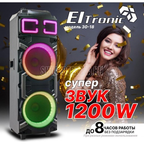 "ElTRONIC 30-18 CRAZY BOX акустическая колонка 2*10"" динамика Режимы воспроизведения: - Bluetooth - Внешний накопитель - Aux - FM Мощность: - 1200 Ватт PMPO - 120 Ватт RMS Питание: - Сеть 220V - Встроенный аккумулятор 12V 7000 mAh Разъемы: - USB - MicroSD - SD - Jack 6.3 мм (микрофон, гитара) 2 шт. Звук: - Частотный диапазон: 50HZ-20KHZ - Сигнал/Шум: 86dB - Разделение: 50dB Комплектация: - Два беспроводных микрофона - Пульт - Кабель AUX - Кабель питания 220V - Инструкция Размер: Ширина - 38 см Высота -105 см Глубина - 38 см Дополнительно: TWS функция соединения двух колонок в акустическую систему через Bluetooth Дисплей Регулировка звучания микрофонов LED подсветка динамика (активная) Шести полосный эквалайзер Возможность записи звука Подключение внешнего АКБ 12V Управление диапазонами частот звучания"
