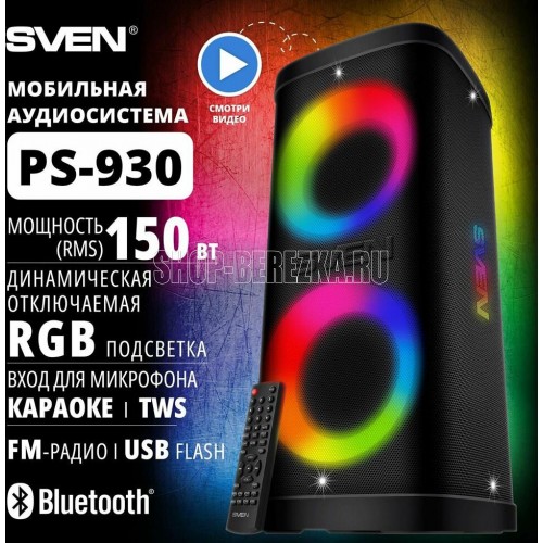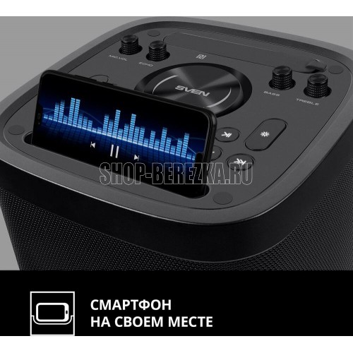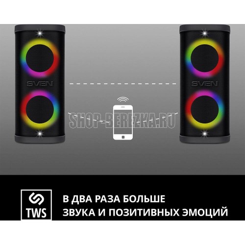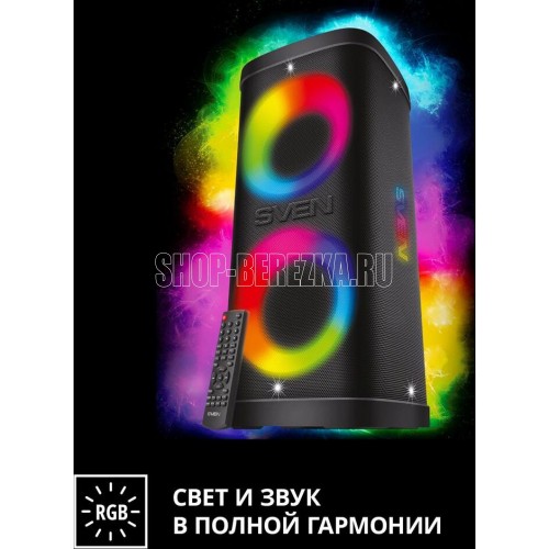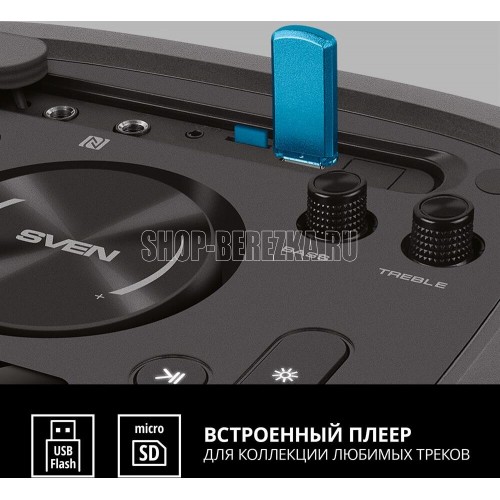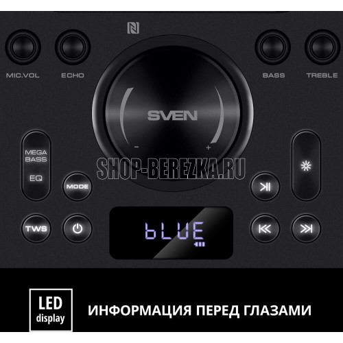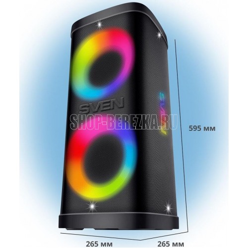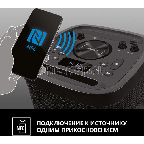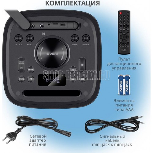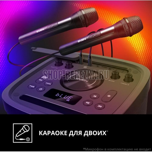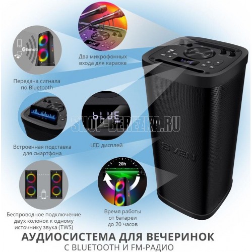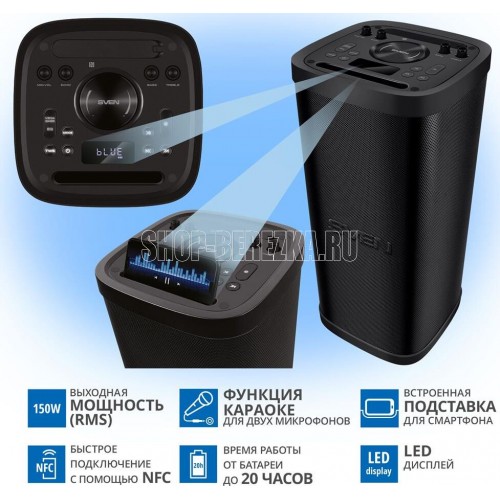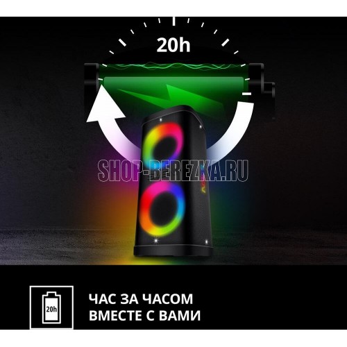 Выходная мощность 150 Вт Передача сигнала по Bluetooth Динамическая отключаемая RGB подсветка Беспроводное подключение двух колонок к одному источнику звука (TWS) Два микрофонных входа для караоке Регулировка уровня эха караоке микрофона FM-радио* Быстрое подключение по Bluetooth с помощью NFC** LED дисплей Воспроизведение музыки с USB flash и microSD карт памяти Стробоскоп Ручка для переноски Время работы от батареи до 20 часов Встроенная подставка для смартфона Вход AUX для подключения источника звука Функция эквалайзера Пульт ДУ Функция усиления баса