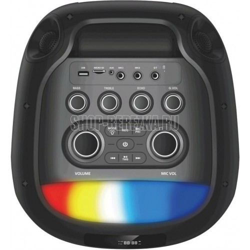 "Режимы воспроизведения: - Bluetooth - FM - Внешний накопитель - Aux Мощность: - RMS 100 Ватт - PMPO 1000 Ватт Питание: - 220V - Встроенный аккумулятор 12В 4.5А (до 5 часов работы) Разъемы: - USB - MicroSD - AUX - Jack 6.3 мм (микрофон-гитара) 3 шт. Комплектация: - Колонка - Кабель питания - Беспроводной микрофон-1 шт - Пульт ДУ - Инструкция - Кабель AUX 3.5mm Размеры упаковки: Ширина - 38 см Высота - 84 см Глубина - 36 см Дополнительно: LED подсветка Регулировка громкости микрофона Дисплей Приоритет микрофона Регулировка эхо микрофона Удобная ручка для переноски Встроенный эквалайзер"
