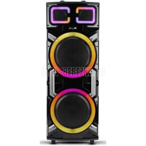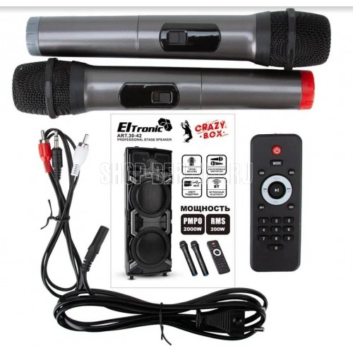 "ElTRONIC 30-42 CRAZY BOX акустическая колонка 2*15"" динамика Режимы воспроизведения: - Bluetooth - Внешний накопитель - Aux Мощность: - 2000 Ватт PMPO - 200 Ватт RMS Питание: - Сеть 220V - Встроенный аккумулятор 12V 12000 mAh Разъемы: - USB - MicroSD - SD - Jack 6.3 мм (микрофон, гитара) 2 шт. - AUX 3.5 мм Частотныне характеристики: - ИМПЕДАНС 4 ОМ - ЧАСТОТНЫЙ ДИАПАЗОН 50HZ-20KHZ - СИГНАЛ/ШУМ: >= 70dB - РАЗДЕЛЕНИЕ: >= 50dB Комплектация: - Два беспроводных микрофона - Пульт - Кабель питания 220V - AUX кабель - Инструкция Размер упаковки: Ширина - 55 см Высота -131 см Глубина - 41 см Вес нетто: 31кг Вес брутто: 34,5 Дополнительно: TWS функция соединения двух колонок в акустическую систему через Bluetooth Дисплей Регулировка звучания микрофонов LED подсветка динамика (активная) Эквалайзер встроенный Возможность записи звука Колесики рояльного типа"