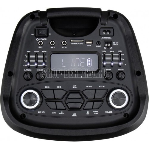 "Режимы воспроизведения: - Bluetooth - FM - Внешний накопитель - Aux Мощность: - RMS 120 Ватт - PMPO 1200 Ватт Питание: - 220V - Встроенный аккумулятор 12В 7А (до 5 часов работы) Разъемы: - USB - MicroSD - AUX - Jack 6.3 мм (микрофон-гитара) 3 шт. Комплектация: - Колонка - Кабель питания - Беспроводной микрофон - 2 шт - Пульт ДУ - Инструкция - Кабель AUX 3.5mm Размеры упаковки: Ширина - 40 см Высота - 87 см Глубина - 34 см Вес брутто: 19 кг Дополнительно: LED подсветка Регулировка громкости микрофона Дисплей Приоритет микрофона Регулировка эхо микрофона Удобная ручка для переноски Встроенный эквалайзер Колесики для перемещения"