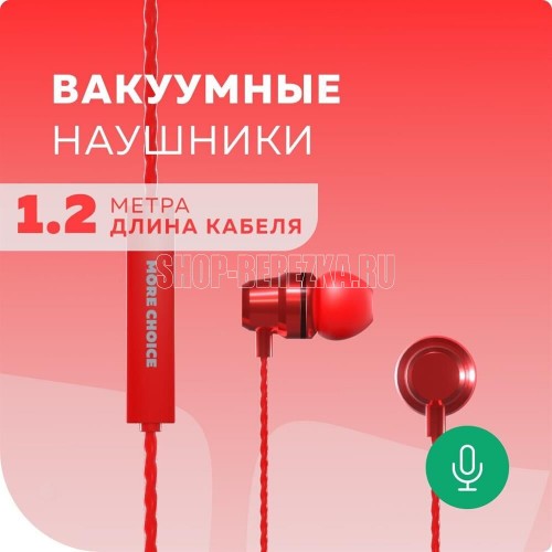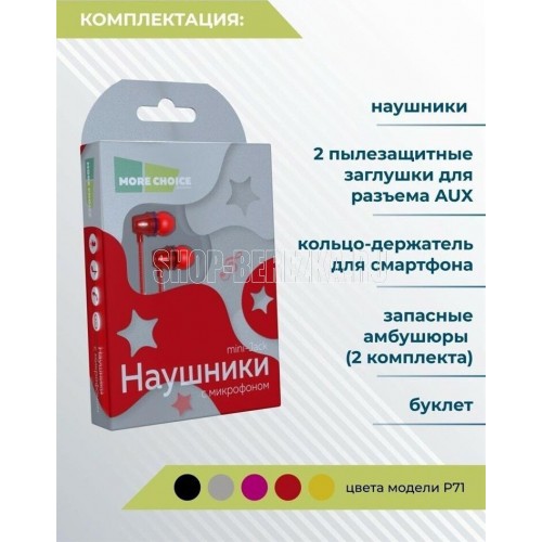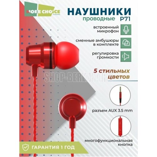 MORE CHOICE P71 Наушники вакуумные AUX разъём с микрофоном и рег.громкости длина 1.2м Тип наушников: вакуумные Разъём: miniJack 3,5 мм Динамик: 10 мм Частотный диапазон: 20-20000 Гц Чувствительность: 110дб±3дБ Импеданс: 32 Ом Микрофон: контроллер с микрофоном Управление проводом: функциональное управление звонками, громкостью и треками Кабель: TPE высокой упругой тесьмой и эмалированных проводов Длина кабеля: 1,2 м