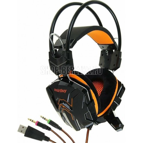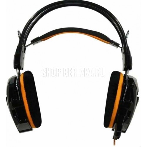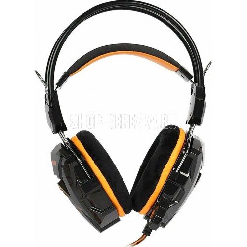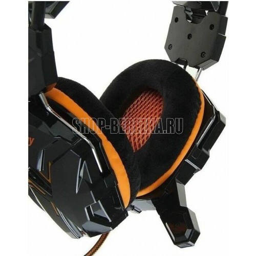 Полноразмерная проводная игровая гарнитура с подстветкой. Велюровые амбушюры и мягкое оголовье обеспечат комфорт во время самых напряженных баталий. Дублирующие оголовье рейки обеспечат лучшее прилегание, которое позволит сосредоточиться только на игре. А регулируемые по высоте металлические направляющие обеспечат прочность изделия. Диаметр динамиков: 40 мм. Частотный диапазон наушников: 18 Гц — 20 кГц. Чувствительность наушников - 103 дБ. Чувствительность микрофона - 58 дБ. Крепление микрофона: на левой чашке наушников. Управление: уровень громкости / отключение звука. Длина кабеля: 2.2 м. Объемный звук. Усиленная звукоизоляция. Мягкое оголовье идеально подходит для долгой игры. Сверхчувствительный микрофон. Прочный кабель. LED подсветка. Интерфейс соединения - 2 х 3,5мм + USB (для подсветки).
