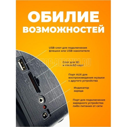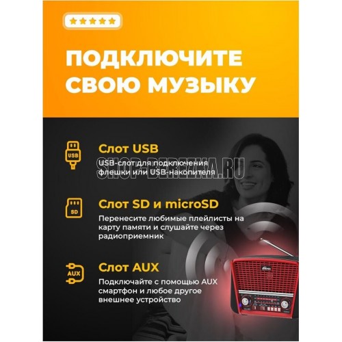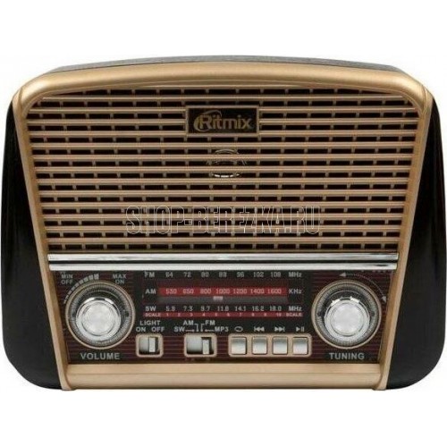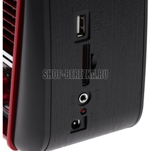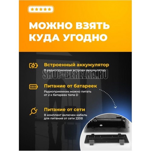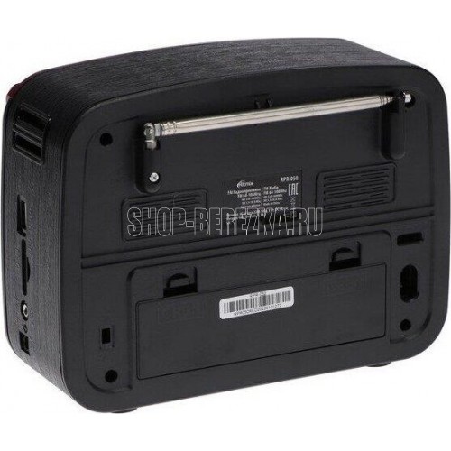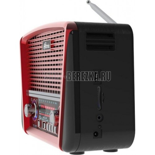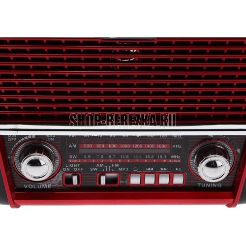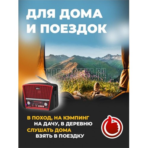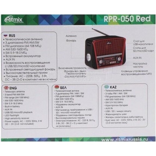 Портативный трёхдиапазонный радиоприемник FM / AM / SW, функция MP3-плеера (читает файлы с microSD/SD/USB носителей), антенна телескопическая 360°, питание встроенный аккумулятор / батарейки 2 x R20 / сеть 220 В, выходы 3,5 мм (на наушники), устройство снабжено встроенным фонарём повышенной яркости