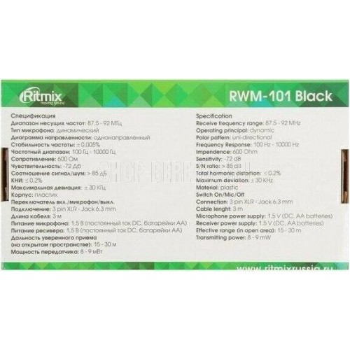 Динамический микрофон, способ передачи: беспроводной/проводной, диапазон несущих частот 100 - 100 МГц / 87,5 - 92 МГц , стабильность частоты ± 0,005%, мощность передатчика 8-9 мВт, чувствительность микрофона -72 дБ, съёмный шнур, выходы - радио, штекер 6,3 мм, радиус действия - до 15 м .