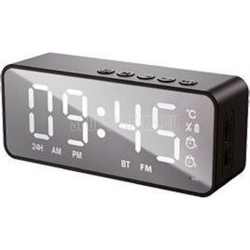 Светодиодный дисплей с высотой символов 1.1” (2.7 см) Регулируемая яркость дисплея (2 уровня) Кварцевый стабилизатор Два будильника Один режим работы будильника (сигнал) Формат времени 12/24 часа Bluetooth 5.0 FM-тюнер (87.5 – 108 МГц) Выходная мощность: 3 Вт Поддержка TF-карт (до 32 ГБ) Воспроизведение формата MP3 Функция Hands-Free Встроенный аккумулятор: 1200 мАч Питание от адаптера (в комплекте) Цвет: чёрный