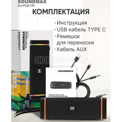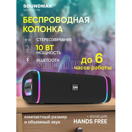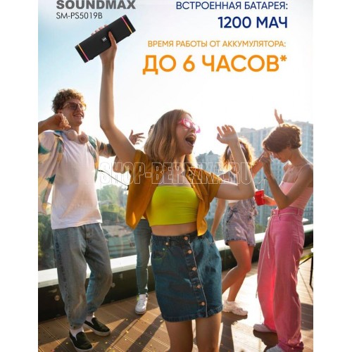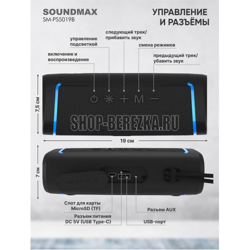 Звуковая схема: 2.0 Выходная мощность: 10 Вт Размер динамиков: 2*2" + 2 пассивных излучателя Bluetooth 5.3 Поддержка аудионосителей: USB/microSD Аудиовход AUX-in Воспроизведение форматов MP3, WAV Функция Hands Free FM-радио Функция True Wireless Stereo Встроенная батарея: 1200 мАч Время работы от аккумулятора: до 6 часов* Светодиодная подсветка Ремешок для переноски Цвет: черный Вес: 0.53 кг Размеры: 75(в) х 188(ш) х 67(г) мм